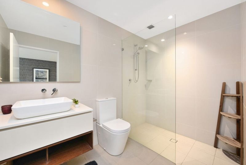 – Luxurious bathroom with frameless glass walk in shower